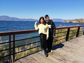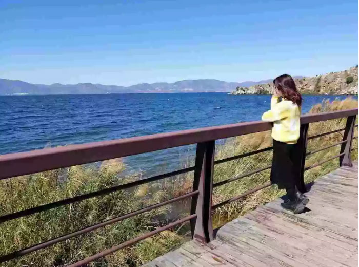蓝蓝的天空从湖面倒影,天边的暖阳乘着风在湖面荡漾,那涟漪的柔情安放在古老的小桥,静静地,犹如出尘的你,带着梨涡的浅笑,在清风里安然。走近,走近,像是融入抚仙湖的美景,你轻轻的将手立在胸前,比出爱你的手势。清风徐来,你秀丽微曲的长发在风中眷恋,甜甜的空气将你融入。看,从天边垂落的光,将你鹅黄色的着装闪耀,煜煜的光辉如深夜里皎洁的月色,照亮着前行的路。